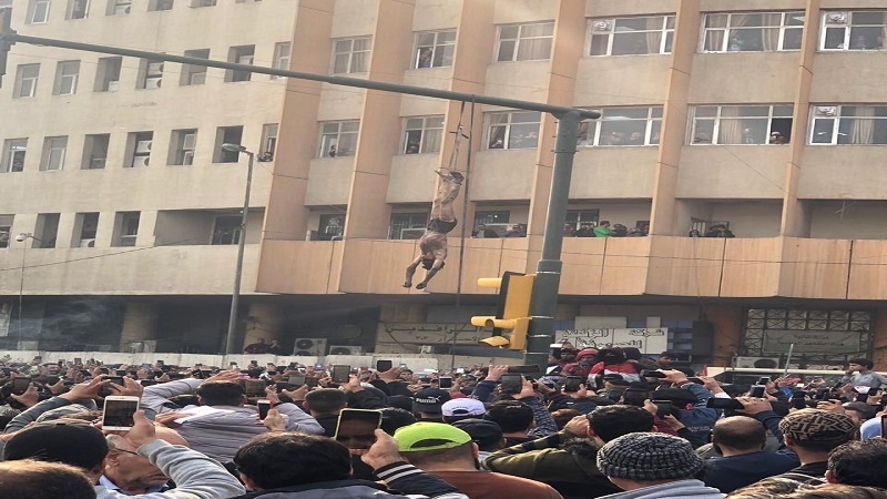 Katika mwenedelezo wa mashambulizi ya makundi ya wahalifu yanayofuatana na maandamano ya amani ya wananchi wa Iraq ikiwa ni pamoja na mauaji yanayofanywa na makundi hayo na kuwafyatulia risasi waandamanaji, Akhamisi ya jana mitandao ya kijamii ilionesha picha ya kijana aliyekuwa na umri wa miaka 16 akiwa ametundikwa kwenye mlingoti wa taa kwenye Medani ya al Wathba mjini Baghdad.