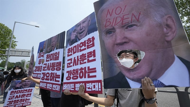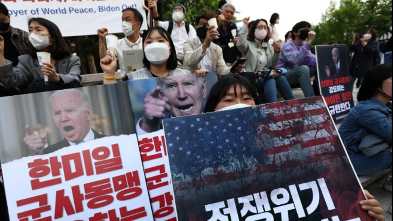 Wapinzani wa ziara ya Rais wa Marekani nchini Korea Kusini wamekusanyika mitaani mjini Seoul wakiwa na mabango yenye maandishi yaliyosomeka: "Ziara ya Biden Korea Kusini yazidisha mgogoro wa vita", "tunapinga kuingia utawala wa Yoon Seok-youl katika vita baridi vya Marekani" na "tunapinga ushirikiano wa kijeshi kati ya Japan na Korea Kusini."