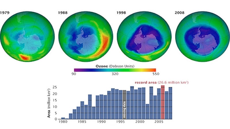 Hata hivyo tangu mwanzoni mwa muongo wa 1970, kwa mara ya kwanza, katika anga ya eneo la Antaktika (yaani Ncha ya Kusini mwa dunia), watafiti waligundua kuweko uharibifu katika tabaka la Ozoni. Awali ilidhaniwa kuwa, sababu za kutokea uharabifu huo ni gesi za Nitrogen Oxide zinazozalishwa na safari za ndege zinazokwenda mwendo wa kasi katika Angahewa (Atmosfia). Hata hivyo mwaka 1974 baadhi ya mada za kemikali zinazozalishwa na wanadamu zinazojulikana kwa jina la klorofluorokaboni (chlorofluorocarbon (CFC)) zilionekana katika tabaka la Ozoni. Gesi za CFC ni gesi zinazotengeneza ubaridi kwenye majokofu na viyoyozi na vilevile zinatumika katika utengenezaji wa mada za plastiki. Gesi hizo zina atomu zenye athari mbaya na wakati zinapopanda kwenda katika tabaka za juu ya ardhi, atomu za gesi hiyo hutawanyika baada ya kupigwa na mionzi ya jua na kuharibu haraka molekuli zinazounda gesi ya Ozoni. Gesi hizo za CFC ni mbaya kiasi kwamba, kila atomu yake inapotawanyika kwa kuguswa na mwanga wa jua hurudi ardhini na kabla ya kufika ardhini huwa imeshaharibu molekuli laki moja za gesi ya Ozoni. Baya zaidi ni kuwa, gesi za CFC hujitafutia makazi ya kudumu katika tabaka la Angahewa (Atmosfia) na kuendelea kufanya uharibifu katika tabaka la Ozoni kwa muda mrefu. Mwaka 1985 kundi moja la wataalamu liligundua kuweko uharibifu mkubwa katika eneo la Antaktika (Ncha ya Kusini mwa dunia), uharibifu ambao ulionekana waziwazi kwa jicho. Baada ya hapo, uharibifu mkubwa zaidi ulionekana mwaka 2006 kwenye eneo hilo. Hata hivyo janga kubwa zaidi ni kwamba, ripoti zote za Shirika la Taifa la Masuala ya Anga na Anga za Juu la Marekani zimeonesha kuwa, thuluthi mbili ya tabaka la Ozoni juu ya eneo la Ncha ya Kusini mwa dunia litakuwa limeharibiwa kikamilifu, na taathira zake kuenea dunia nzima. Wasiwasi uliopo hivi sasa ni kuwa, shimo hilo lilioko kwenye eneo la Antaktika litapelekea kuangamia maisha ya viumbe vyote hai katika sayari ya ardhi.