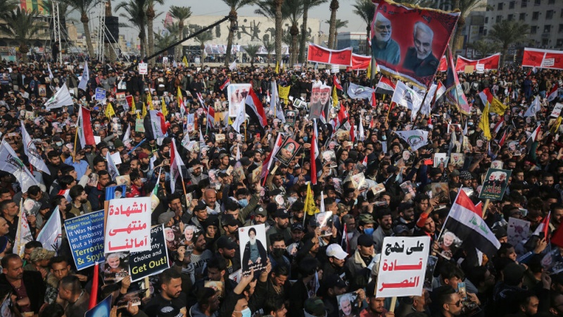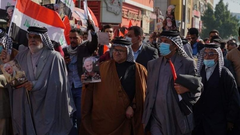 هزاران نفر از مردم عراق با تجمع گسترده در میدان «التحریر» بغداد، مراسم باشکوهی را به مناسبت نخستین سالروز شهادت سردار سپهبد «قاسم سلیمانی» و شهید «ابومهدی المهندس» برگزار کردند.
