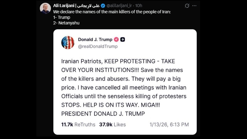 Пас аз даъвати Доналд Трамп, раисиҷумҳури Амрико аз террористҳои мусаллаҳ барои идомаи фаъолият дар хиёбонҳои Эрон ва инки гуфт, номи қотилонро ба хотир бисупоред, Алии Лориҷонӣ, дабири Шӯрои олии амнияти миллии Эрон дар паёме ба ӯ ингуна посух дод: «Номи қотилони аслии мардуми Эронро эълом мекунем: 1 - Трамп 2 - Натаняҳу. /ИСНА
