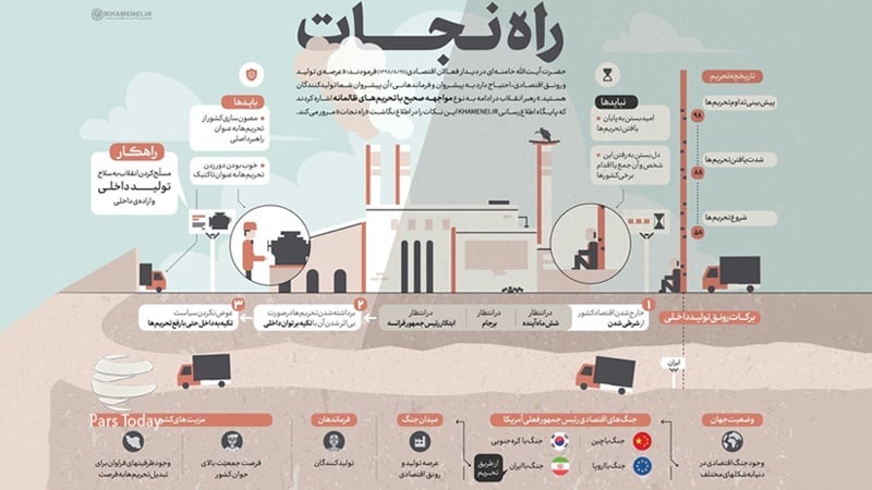 Раҳбари муаззами инқилоб дар дидори фаолони иқтисодӣ (2019/11/19) фармуданд, арсаи тавлид ва равнақи иқтисодӣ эҳтиёҷ дорад ба пешрувон ва фармондеҳоне, он пешрувон шумо тавлидкунандагон ҳастед. Раҳбари муаззами инқилоб дар идома ба навъи ру ба рушавии саҳеҳ бо таҳримҳои золимона ишора карданд .