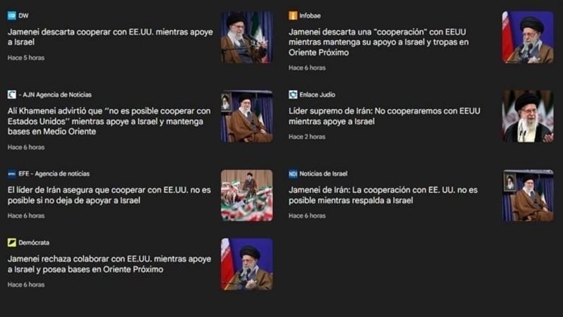 Latyn Amerikasynyň meşhur metbugat serişdeleri Yslam Rewolýusiýasynyň Lideriniň soňky beýanatlaryny giňden beýan edip, Eýranyň ABŞ bilen hyzmatdaşlyk etmek mümkinçiligini Waşingtonyň Sionist režimine goldawyny bes etmegi we goşunlaryny sebitden çykarmagy şerti bilen goýandygyny yglan etdiler, Şeýle hem, olar Aýatolla Hameneýiniň beýanatlaryny Eýranyň ABŞ-nyň daşary syýasatyna garşy gapma-garşylykly pozisiýasyny güýçlendirýän hökmünde häsiýetlendirdiler.