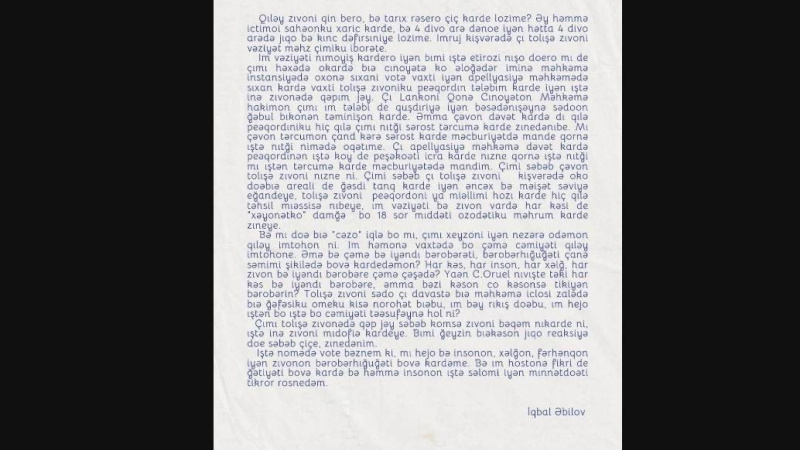 In hərəkət, medya və mədəni iclosonədə Azərbaycan Respublika məhkəməon prosesədə bənə mislış nıbıə hodisə və bə inə zıvon iyən şəxsiyət, İğbol Əbilovi təkidiku qıləy nışonə təhlil bıə.