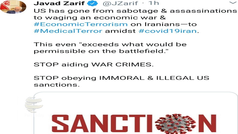Zarif, Twitter hesabından yaptığı açıklamada “Koronavirüs’ün yayıldığı bir dönemde Amerika sabotaj ve cinayeti de aşarak, İranlılar aleyhine ekonomik savaş, ekonomik terörizm ve sağlık terörizmi uygulamaktadır. Bunlar savaş meydanında bile yapılabileceklerin ötesindedir. Savaş cinayetlerine ortaklığı bırakınız. Amerika’nın ahlak dışı ve illegal yaptırımlarına uymayı bırakınız.” diye yazdı.