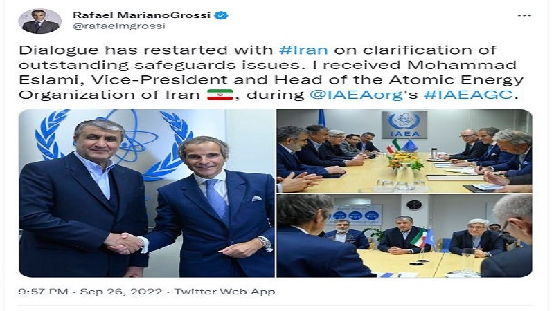 Rafael Grossi, Twitter'dan paylaştığı mesajında, İran İslam Cumhuriyeti Atom Enerjisi Kurumu Başkanı Muhammed İslami ile Viyana'da görüştüğünü ve bu görüşmede, ''Atom Enerjisi Ajansı ile Tahran arasında bazı nükleer tesislerle ilgili koruma konularına ilişkin görüşmelerin yeniden başlatılmasının görüşüldüğünü'' yazdı.
