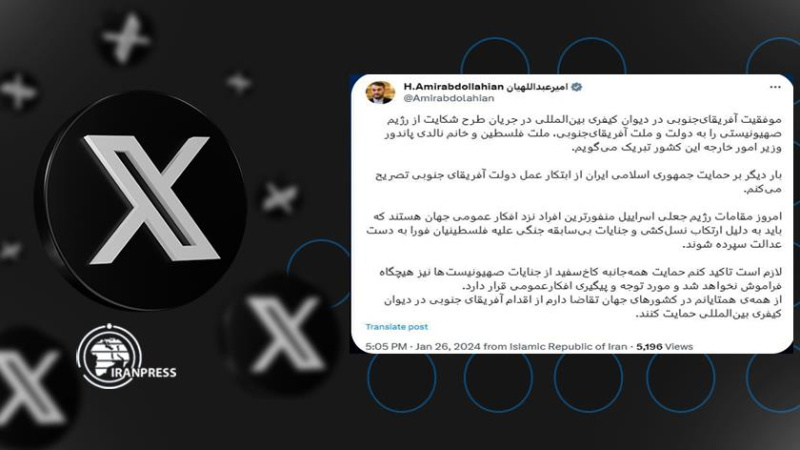 İran İslam Cumhuriyeti Dışişleri Bakanı, Güney Afrika'nın Uluslararası Adalet Divanı'ndaki diplomatik başarısını kutlarken, dünyadaki mevkidaşlarından Güney Afrika'nın eylemini desteklemelerini istedi.