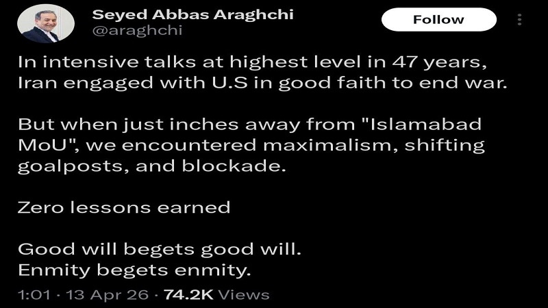 Irakçi, “Son 47 yılın en üst düzeyinde gerçekleştirilen yoğun müzakereler sırasında İran, savaşı sona erdirmek için ABD ile iyi niyetle müzakereye girdi. Ancak ‘İslamabad Mutabakatı’na yalnızca birkaç adım kalmışken, aşırı talepler, sürekli değişen hedefler ve kuşatma tehdidiyle karşılaştık” ifadelerini kullandı.