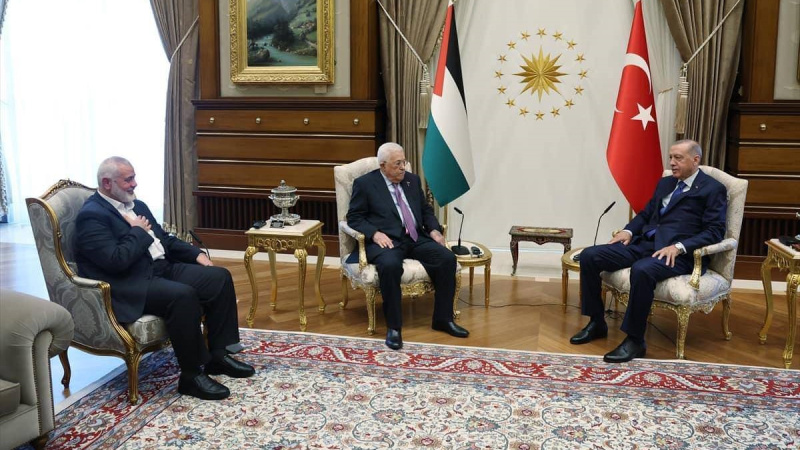 Türkiye Cumhurbaşkanı Recep Tayyip Erdoğan Türkiye'ye resmi ziyarette bulunan Filistin Özerk Teşkilatı Başkanı Mahmud Abbas ve Hamas lideri İsmail Heniyye ile araya geldi.