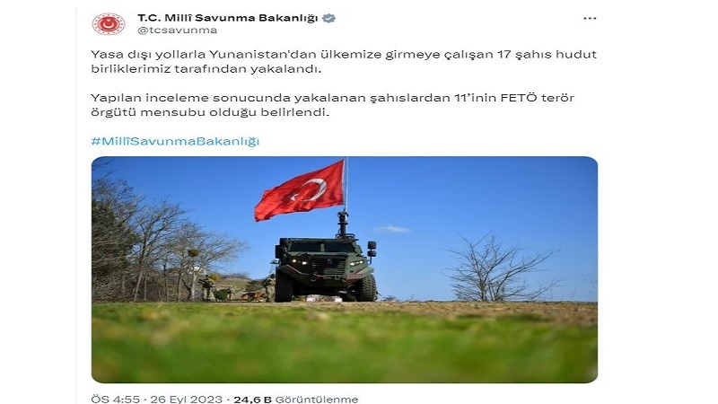 Milli Savunma Bakanlığı'nın sosyal medya hebasından yapılan açıklamaya göre, hudut birlikleri Yunanistan'dan yasa dışı yollarla Türkiye topraklarına girmeye çalışan 17 kişiyi tespit etti.