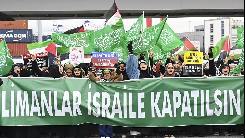 Gazze Dayanışma Platformu gönüllüleri, İstanbul Beylikdüzü Ambarlı Limanı'nda Siyonist rejimle ticaret yapan ve buradaki gemilere malzeme taşıyan şirketleri protesto etti.