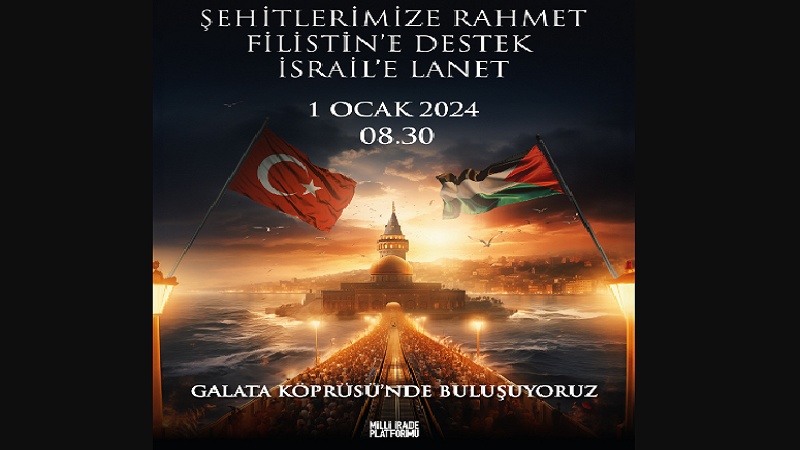 İstanbul, yeni yılın ilk gününde, tarihin en büyük gösterilerinden birine sahne olacak. "Şehitlerimize Rahmet, Filistin'e Destek, İsrail'e Lanet" yürüyüşü için yüz binlerce kişi Galata Köprüsü'nde buluşacak. 308 sivil toplum kuruluşunun düzenleyeceği yürüyüşle hem PKK terörü hem de İsrail zulmü lanetlenecek.