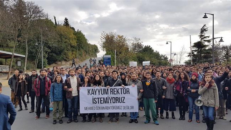 Boğaziçi Üniversitesi öğrencileri, rektörlük görevine Cumhurbaşkanı Recep Tayyip Erdoğan tarafından seçime katılmayan Prof. Dr. Mehmed Özkan'ı atamasına yönelik olarak, üniversitede yürüyüş eylemi gerçekleştirdi.