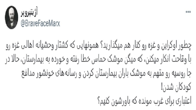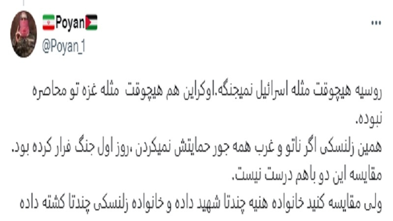 Parstoday'a göre İsrail'in Gazze'de işlediği cinayetlerin başlaması ve Filistin halkının acımasızca öldürülmesinin ardından sosyal medya kullanıcılar bu savaşı birçok durumda Rusya ile Ukrayna arasında gördüğümüz savaşla karşılaştırdı.