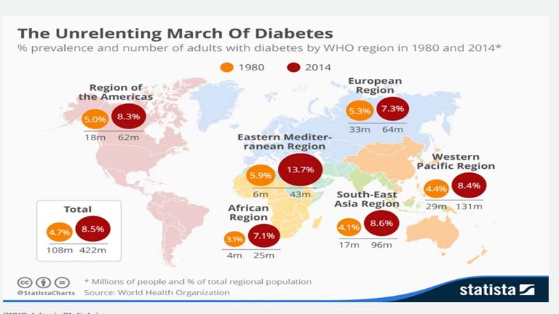 Maalesef dünyada şeker hastalığına yakalanan kişilerin sayısı 400 milyonu aşmıştır. Batı Asya ve Afrika Kuzeyinde diyabete yakalanan kişilerin sayısı ise 2040'a kadar ikiye katlanarak, 72 milyon 100 bine ulaşacağı tahmin edilmektedir. Dünyada 14 yaş altı yarım milyon çocuk ve genç diyabet tip 1'e ve 20 ila 79 yaş arası 415 milyon yetişkin de bu hastalığa yakalanmıştır. Diyabet 2015 yılında beş milyon kadar insanın hayatını kaybetmesine neden olmuş ve 2040 yılına kadar da dünyada şekerli hastaların sayısının 643 milyona ulaşacağı tahmin edilmektedir. Diyabetin yıllık masrafları ise yaklaşık 673 milyar dolar kadar tahmin edilmiştir. Böylece ülkelerin sağlık bütçesinin yüzde 12'isinin diyabetin ve yan etkilerinin tedavisi için harcandığı söylenebilir.