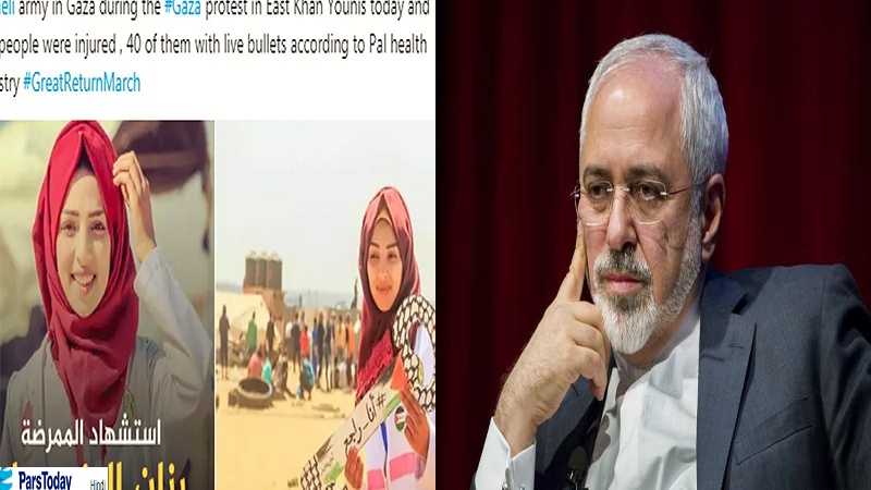 ИРНА ахборот агентлигининг хабарига кўра, Эрон ташқи ишлар вазири Муҳаммаджавод Зариф Твиттер саҳифасидаги мурожаатида, сионистик режими армиясини Фаластиннинг бегуноҳ халқини оммавий қирғин этганини қоралашга асосланган БМТ резлюциясини АҚШ томонидан вето этилганига ишора қилар экан, сионистик режимини эронликларга қарши ақлсизларча ва мантиқсиз мурожаатлари ҳамда бу босқинчи режимининг Ғазо секторидаги бегуноҳ инсонларни оммавий қирғин этганини қоралашга асосланган БМТ резолюциясини АҚШ томонидан вето қилинаётганлиги ҳафталарида бу режимнинг снайперлари ҳам жароҳатланган шахсларга тиббий ёрдам бераётган фаластинлик ҳамширани ўққа тутиб шаҳид этдилар, бу эса сиоинстик режим шармандаликларига қўшимча шармандалик деган гап деб ёзди.