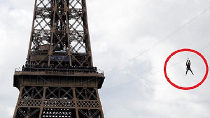 Мусобақанинг иштирокчилари осма арқон орқали Эйфел минорасидан 90 км тезликда пастга сакрашади.