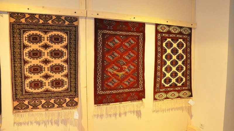 Музей ичкарисида турли туркман давлатларидан турли анъанавий нақшдаги, ҳар бири бу халқ тарихи ва ўзига хослигининг рамзи бўлган турли гиламлар намойиш этилиб, томошабинлар ташриф буюришди. Ушбу Гулистон музейига ташриф буюрганингизда, олти минг йиллик тарихга эга бўлган 811 дан ортиқ дизайн ва белгиларга эга туркман қўлда ишланган гиламларни кўрасиз. Шунингдек, туркманларнинг гиламдўзликда қўллаган нақшлари кўпроқ синган ва геометрик бўлиб, “ахал” деб аталадиган Бухорий нақшларига ўхшашдир. Асл туркман гиламлари субъектив ёки ёдланган бўлиб, бу қўл санъатларини ишлаб чиқаришда туркман аёллари ўзларининг идеал ва ғояларини гилам ипига керакли ранглар билан боғлаб, томошабинларга чиройли ва мазмунли манзарани тақдим этадилар. Гонбад Ковус музейининг қўлда тўқилган гиламлари фонида кўндаланг чизиқлар билан боғланган ёзувлар ёки ромбли рамкалар безатилган. Туркман қўлда тўқилган нақшларнинг асосий мотивлари “гул ёки тамға” (сув ҳавзаси) бўлиб, бу ромбсимон ёки саккиз бурчакли гулларга ишора қилади. Туркман тўқувларида қўлланиладиган энг муҳим нақш ва гуллар қаторига мариголд, соф гул, гул токчаси, гул шохчаси, гул бўлаги, анси, алабалıк гули, тоник гул, гул идиш, аугҳан гул, тож, панжағол, Ақ Нагҳш, Гол Панжеҳ, Арсари киради. Гол, Дали ва Башир, бу жуда кўп ташриф буюрувчилар учун жуда ажойиб.