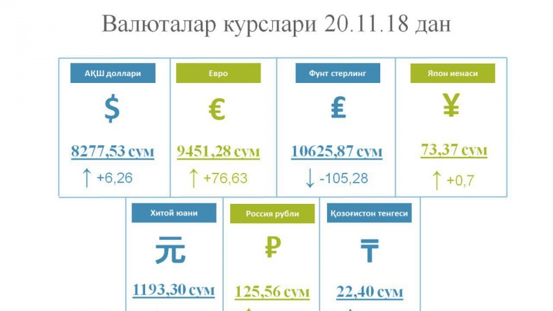 Ўзбекистон Марказий банки хорижий валюталарнинг 20 ноябрдан бошлаб амалда бўладиган янги курсларини эълон қилди.