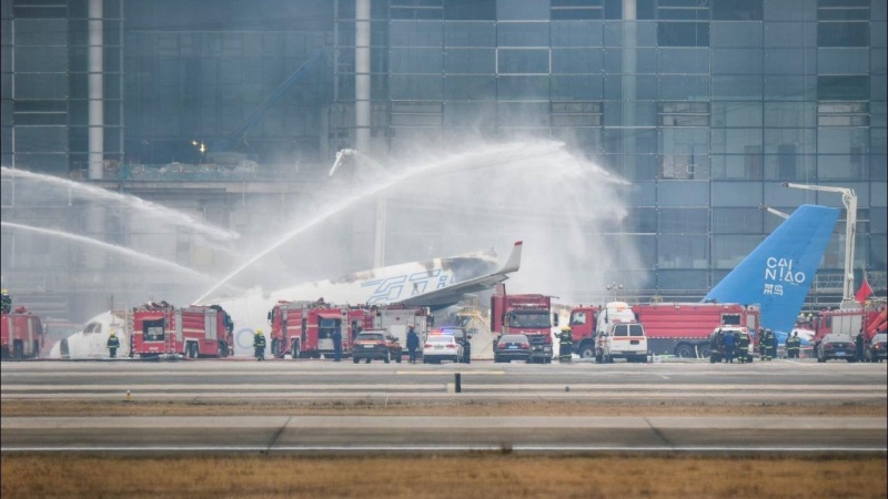 接现场机务紧急通报后,杭州机场立即启动应急程序,消防、急救在2分钟内赶到现场紧急处置,并第一时间成功将8名机组人员救出后转移。