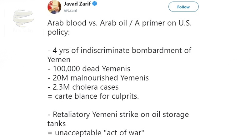 扎里夫在这篇推特消息中写道:阿拉伯血液与阿拉伯石油之争,这是美国政策的基础。4年时间内也门不断发生爆炸、10万名也门人民丧生、2 000万也门人民营养不良、230万也门人感染霍乱=绿灯和犯罪分子的行动自由。 也门对油库进行报复性攻击=对战争行动无法接受