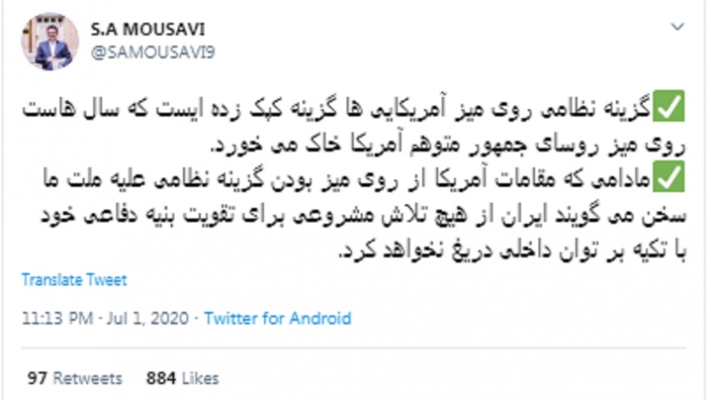 穆萨维还表示:确保该地区各国的安全是伊朗伊斯兰共和国的一项原则性和一贯的政策,并补充说:“伊朗军事计划的性质纯粹是防御性的。”