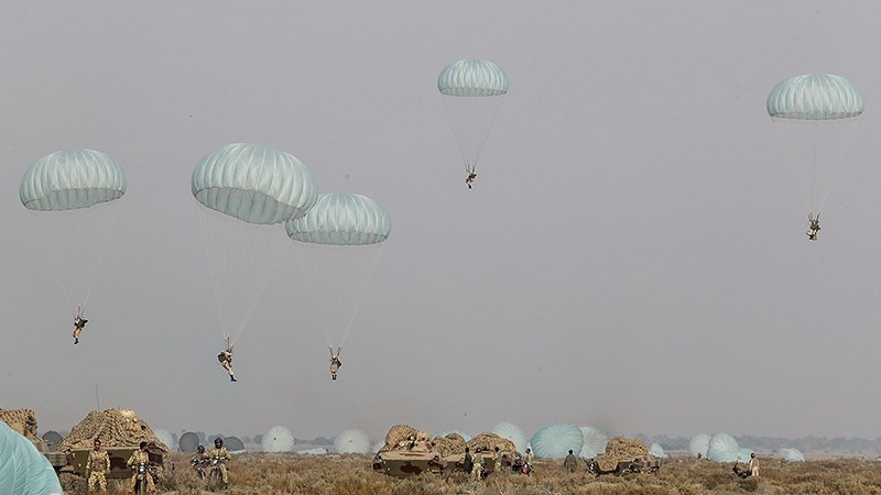 在一次计划的行动中,空降部队出动数百名伞兵,由空军的几架C-130飞机运输指定地点降落成功空降。演习中使用军事武器和装备包括摩托车、107毫米火箭炮和23毫米火炮,并成功击中了岸上的目标。