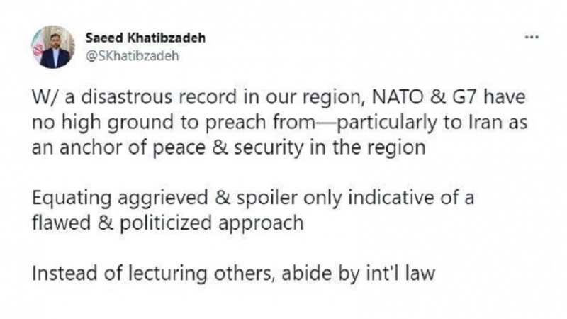 赫体布扎德在推特页面上写道:北约和七国集团曾为本地区带来灾难,没有资格可以向其他国家说教,尤其是向伊朗,伊朗是本地区和平与安全的支柱。