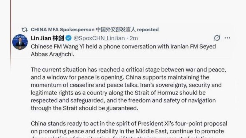 据今日帕尔斯(Parstoday)援引伊朗国家电视台(IRIB)从北京报道:中国外交部发言人林剑在其个人社交媒体账号上发文,呼吁维持停火并继续与伊朗进行和平对话。中国外交部发言人对当前局势处于战争与和平之间的临界点发出警告,他表示:“既然实现和平的窗口已经打开,中国支持维持停火、进行和平对话,并支持伊朗作为霍尔木兹海峡沿岸国维护其主权、安全及合法权利。”