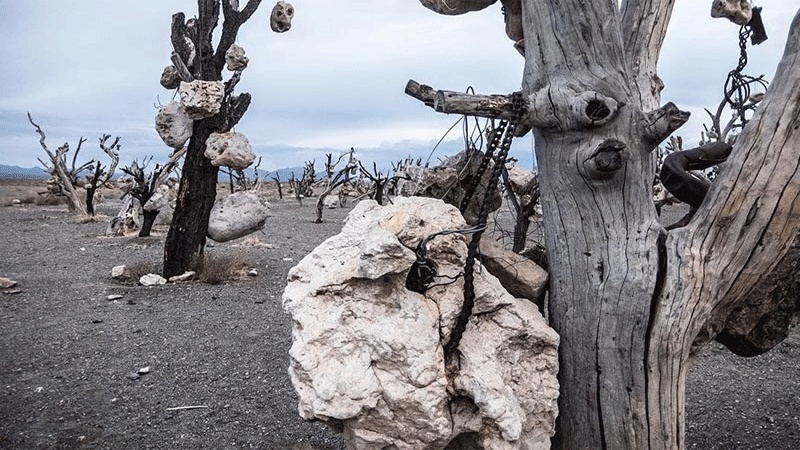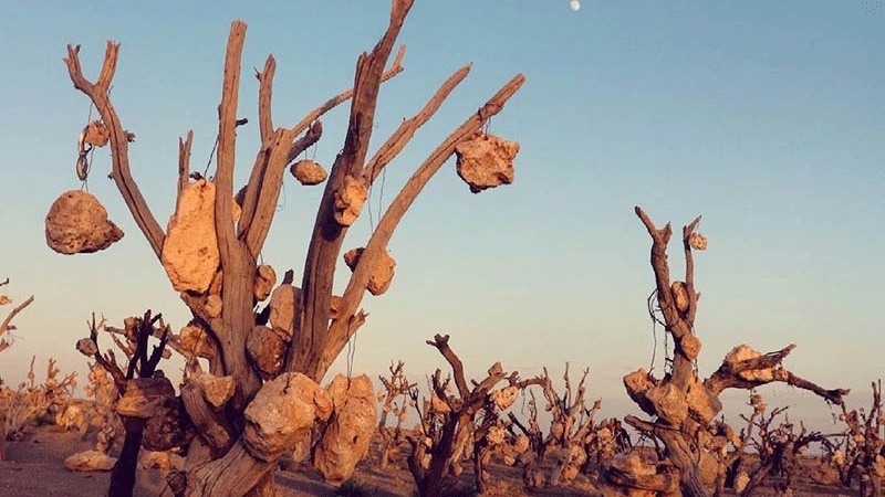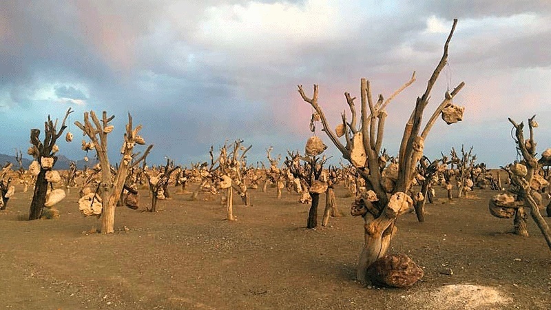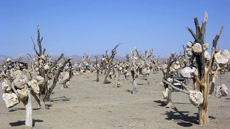 1964年,随着国王巴拉维(King Pahlavi)实施土地改革的计划,他失去了大部分土地。一段时间后,树木干枯,他变得灰心懈怠,过了许久,达许•汗(Darwish Khan)又把干枯树木收集起来种植在一个园子中,又过了一段时间,他从周围的山上收集了很多奇形怪状的石头,并用铁丝将它们固定在枯木上,就这样他不断地一直到他生命的最后几天,一个石头园林就这样诞生。